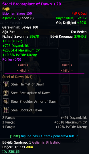 • Seviyeler için teçhizatı görmek istiyorum: 100-100