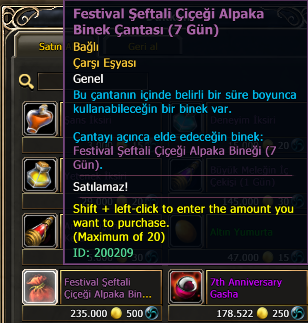 • I believe the price of 200209 [Festival Peach Blossom Alpaca Mount Bag (7 Days)], sold by 124129 [Forkas Garry] in Varanas, is too high for new players.