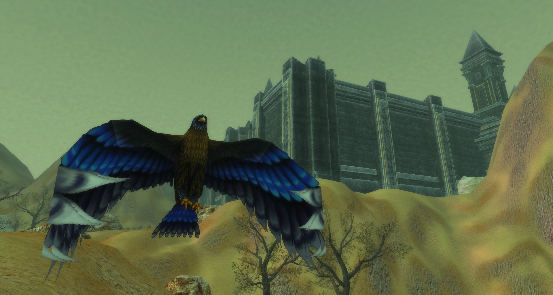 A lone bird circles the field