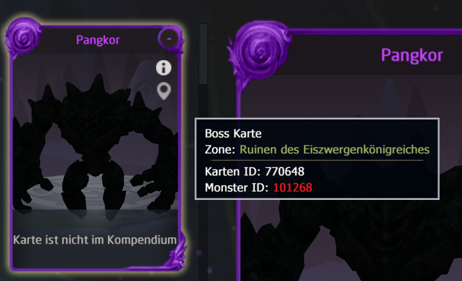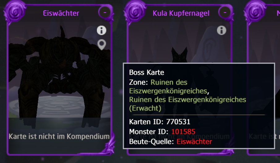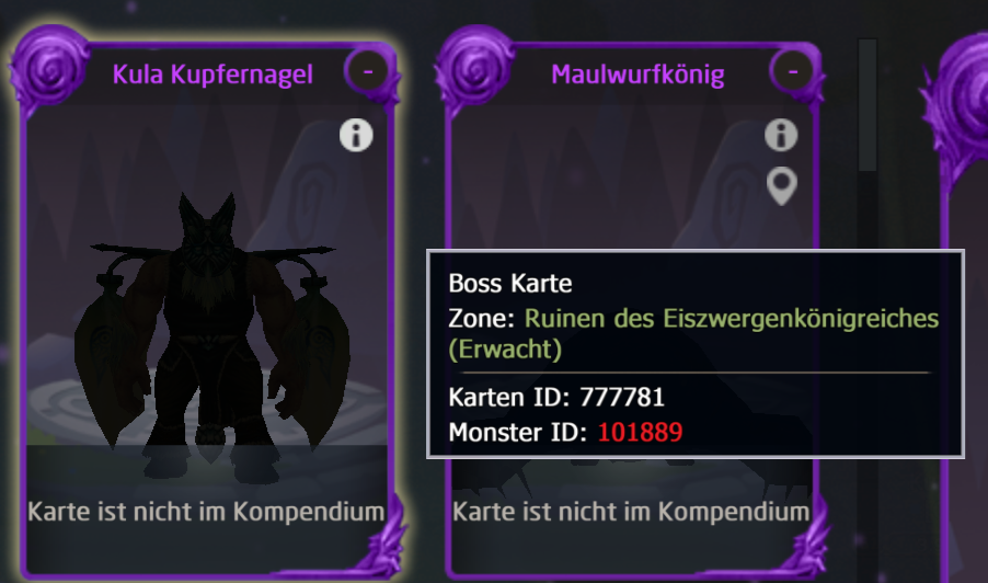 Other cards show both dungeons (normal/awakened) in the tooltip, like Eiswächter.