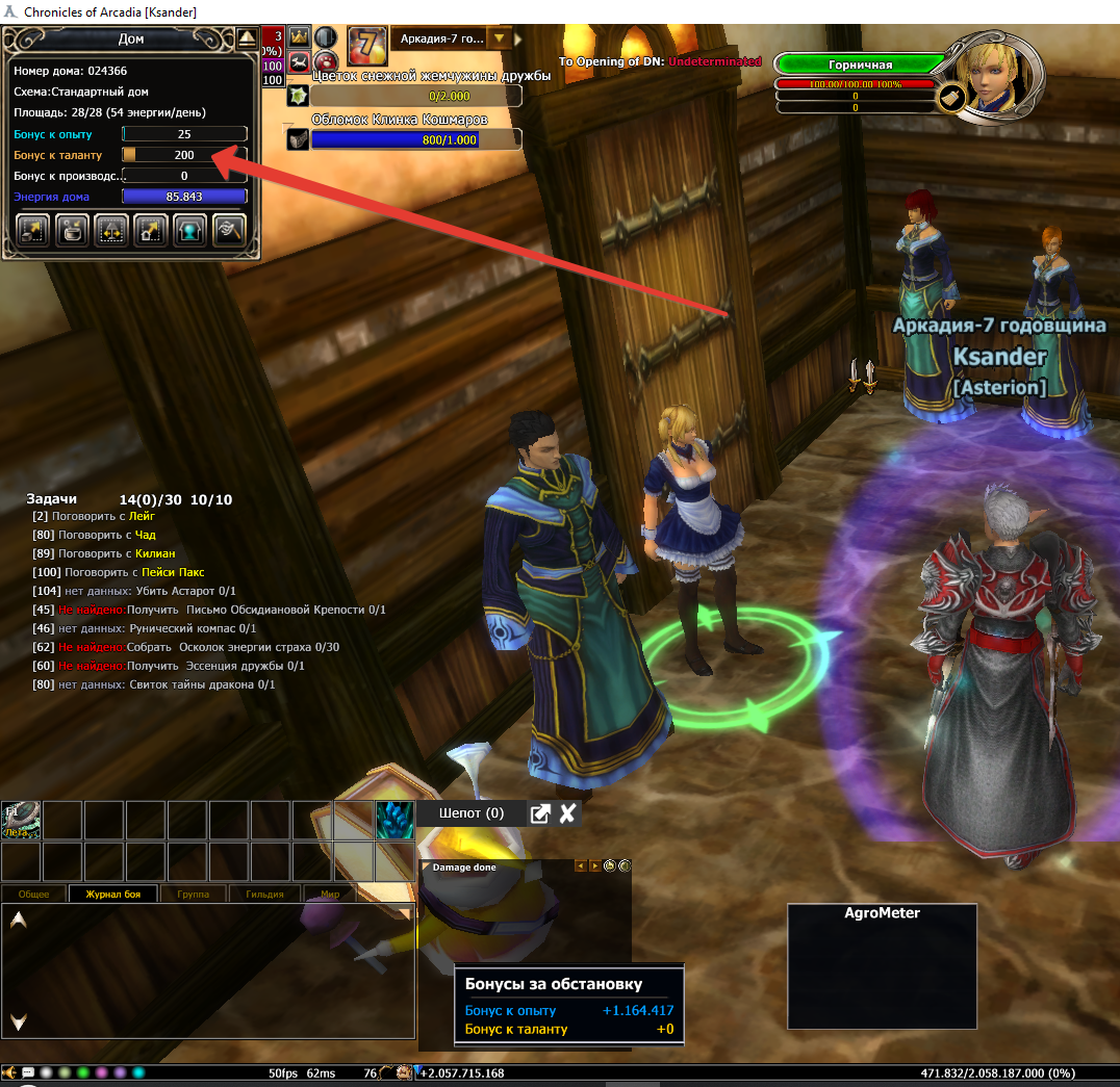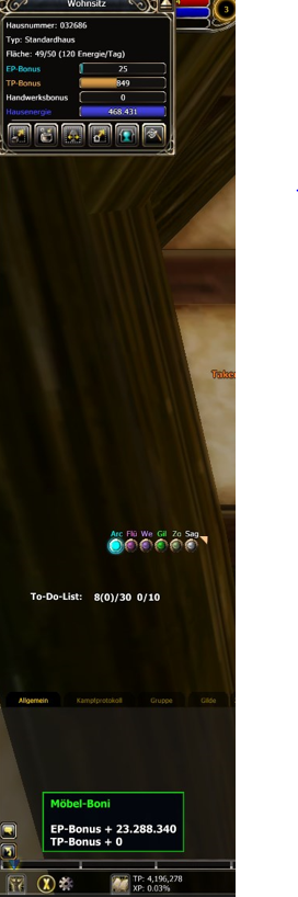 Im Fenster "Wohnsitz" (oben links) wird EP Bonus 15 und TP Bonus 15 angezeigt.