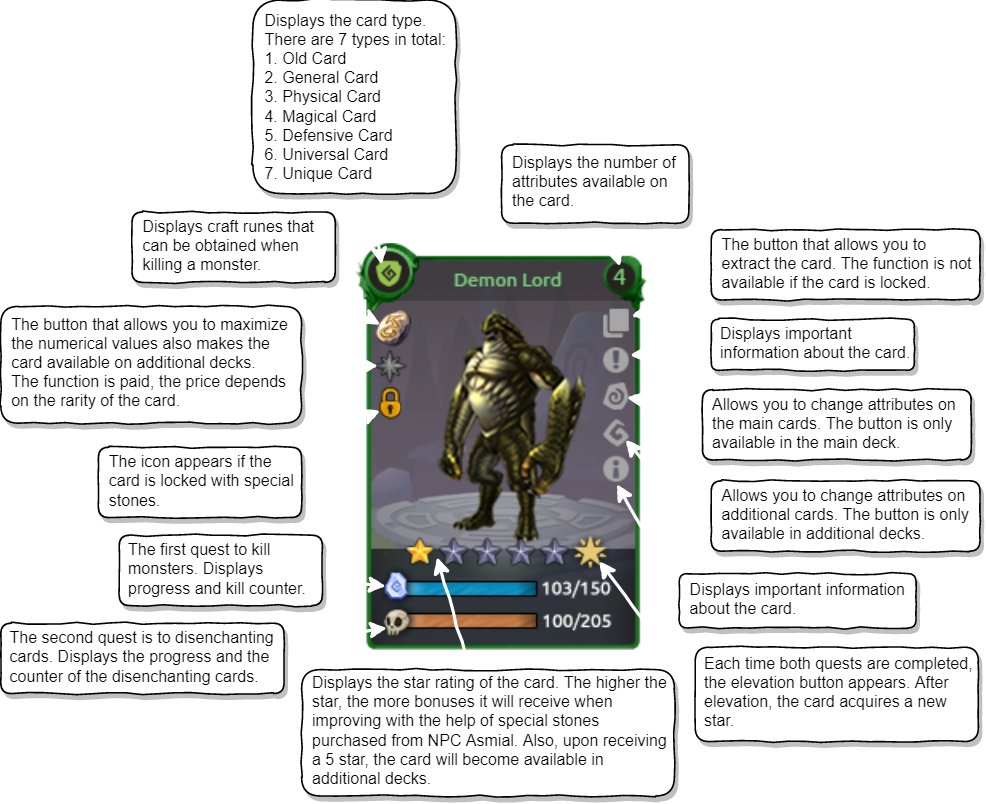 • Regarding CardID 777656. Its impossible to level the starlevel of this card^^ The mob is an NPC which you can't kill so only the disenchanting part works