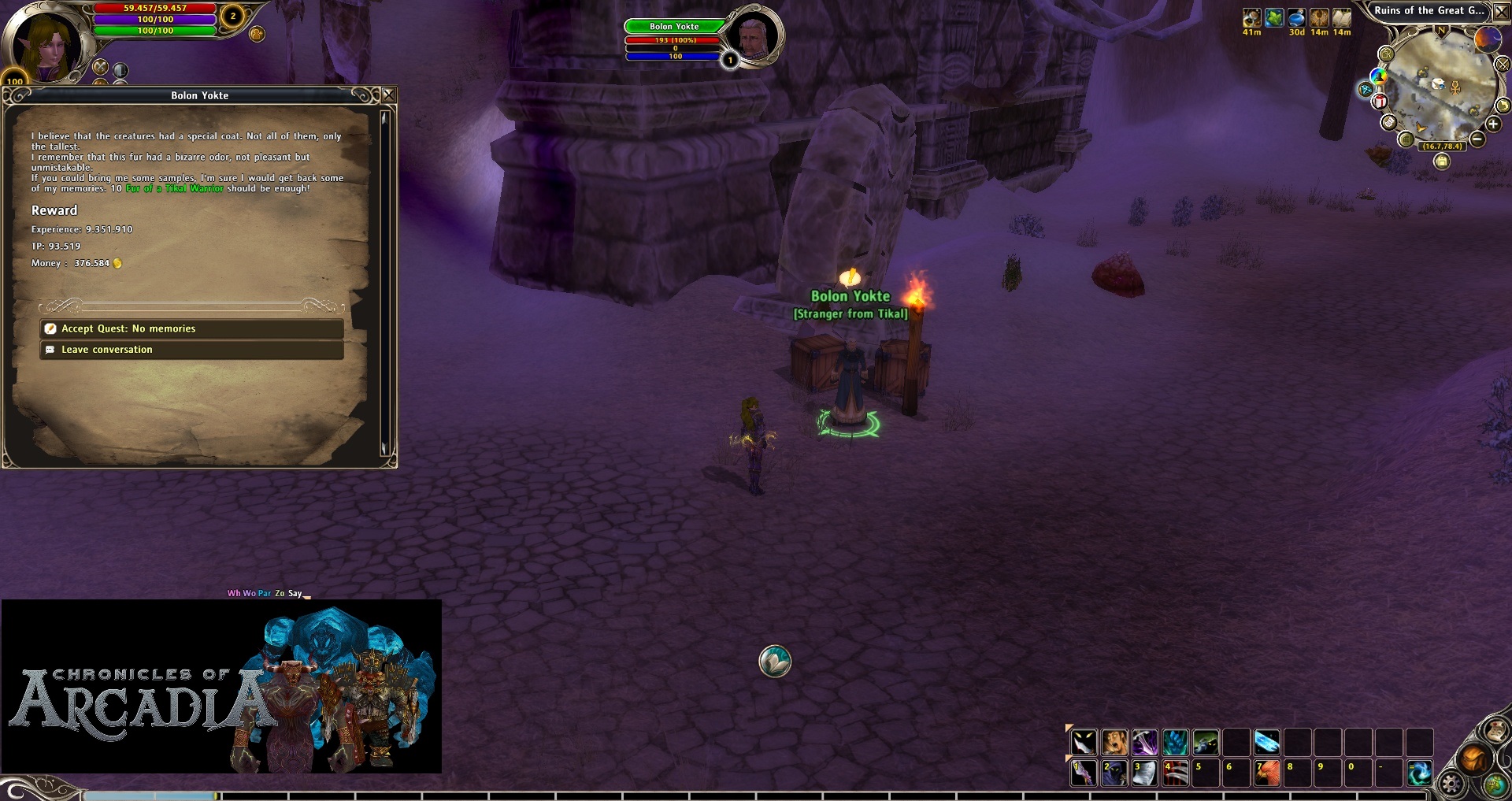 No memories: Talk to Bolon until he gives the next quest. Now we have to get 10x “Fur of a Tikal Warrior” (both Tikal Warrior and Tikal Sage mobs will give them). Warning! They have a big amount of HP and they do way more damage than normal mobs. It is possible you need to ask for help if you are a new player. Once we have all of them, we go to Bolon Yokte.