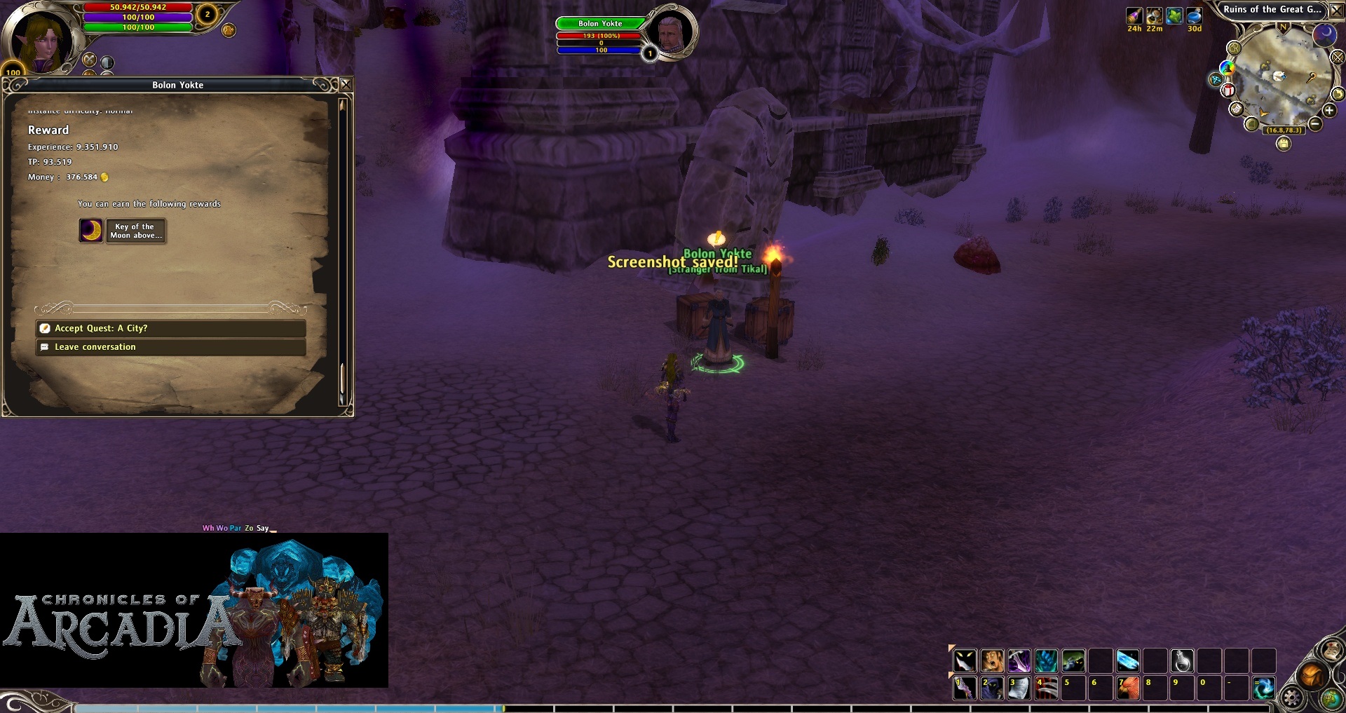A city?: Also at Bolon, just need to talk to him until he gives it. Is the first one of the “hard” quests in this process and you will probably need help from one person or even from a group. Quest is asking us to go to different instances to kill the final boss. Once we have this completed, we will get the first key (there are three). This key is called, “Moon”.