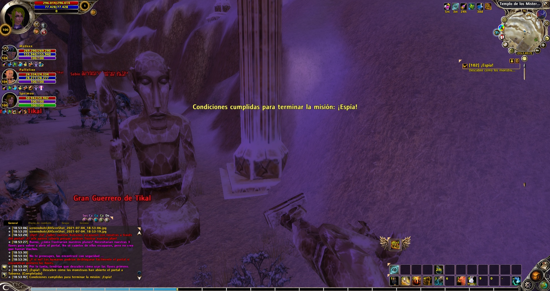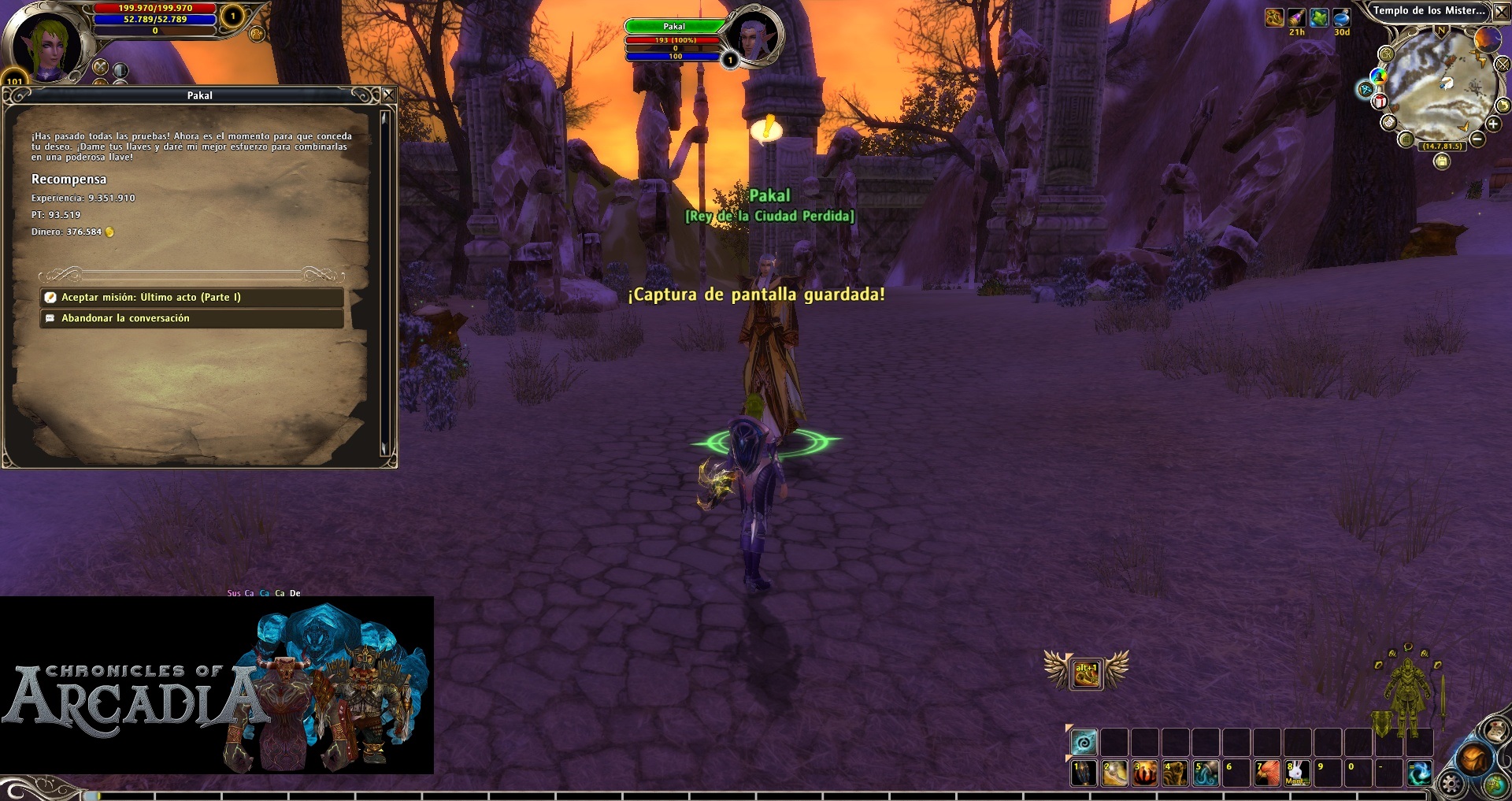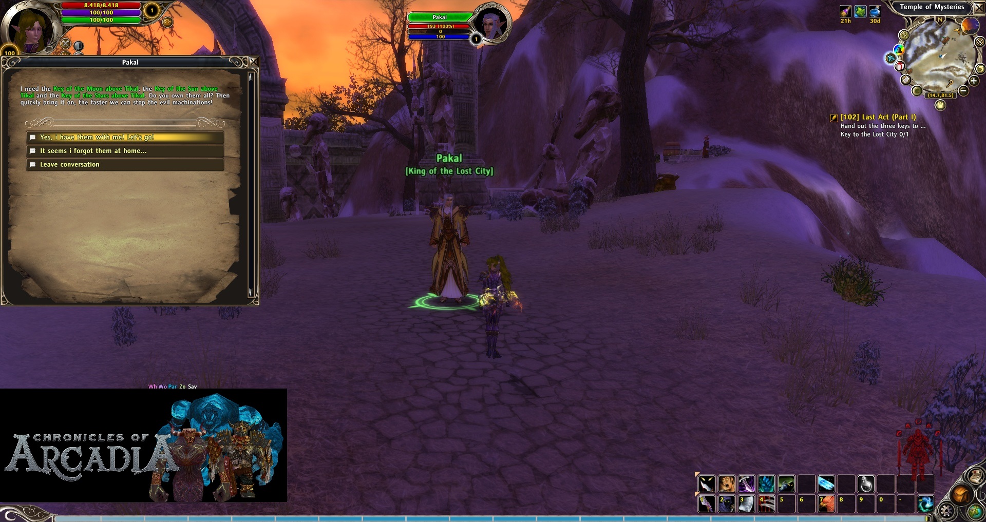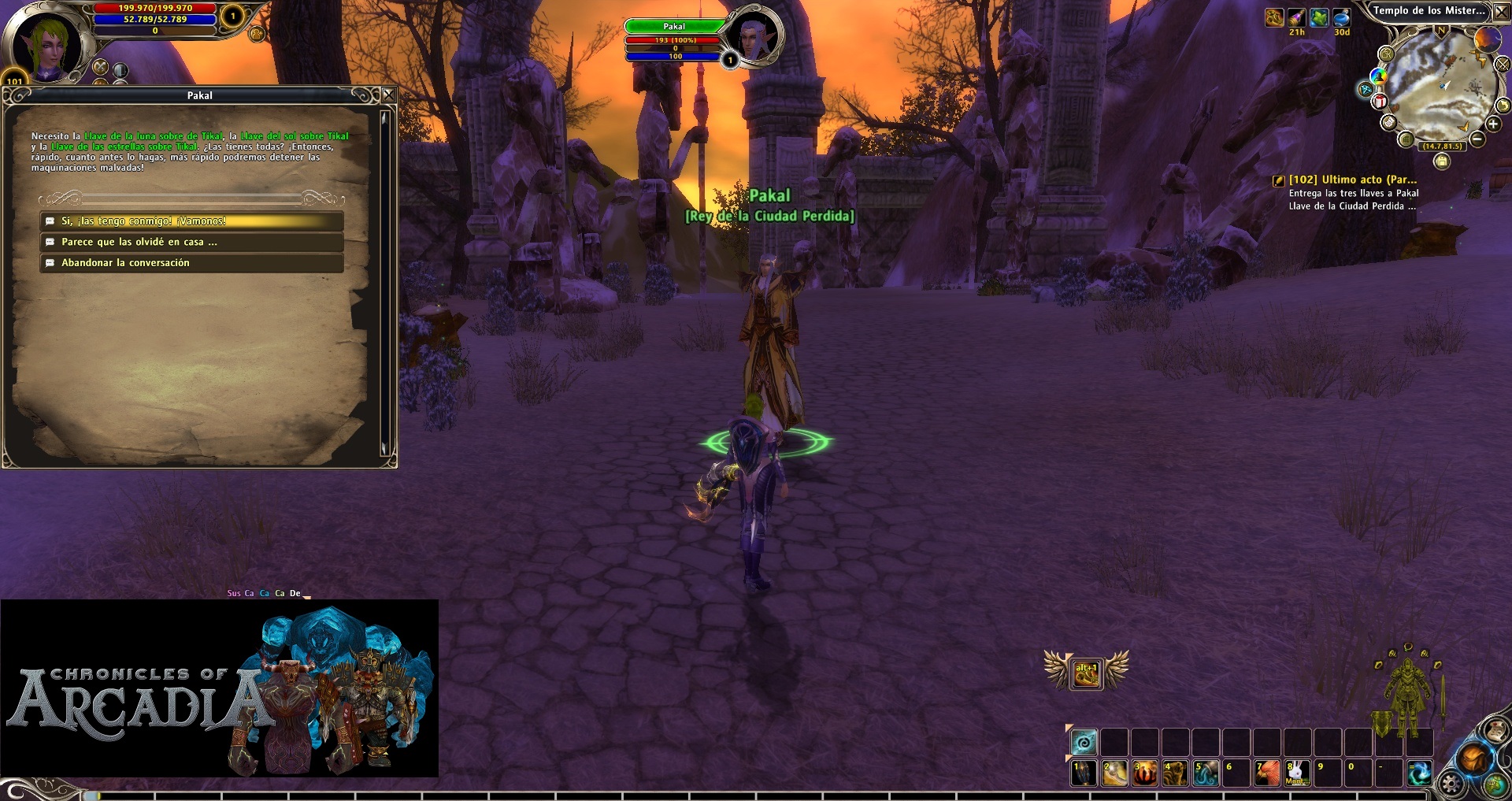 Last Act (Part I): Right where we delivered the previous quest, a NPC appears and is called Pakal, King of the Lost City. We must give him the three keys (Moon, Sun and Stars). He will disappear and we should walk a little because he will be waiting right after the zone full of Tikal Warriors and Tikal Sages mobs. We talk to him to finish the quest.