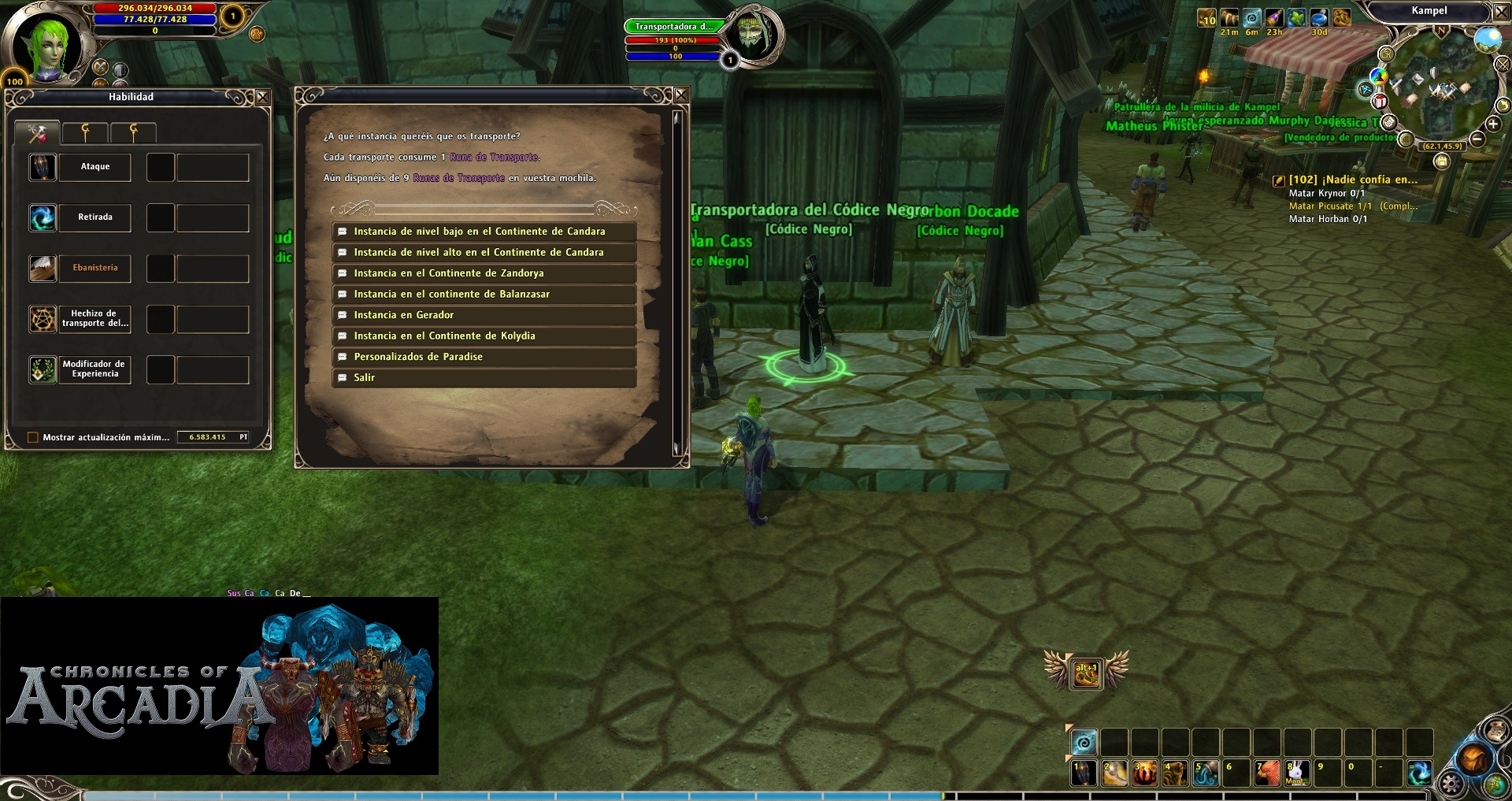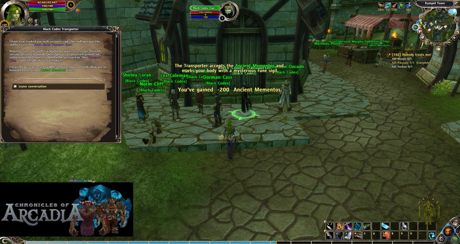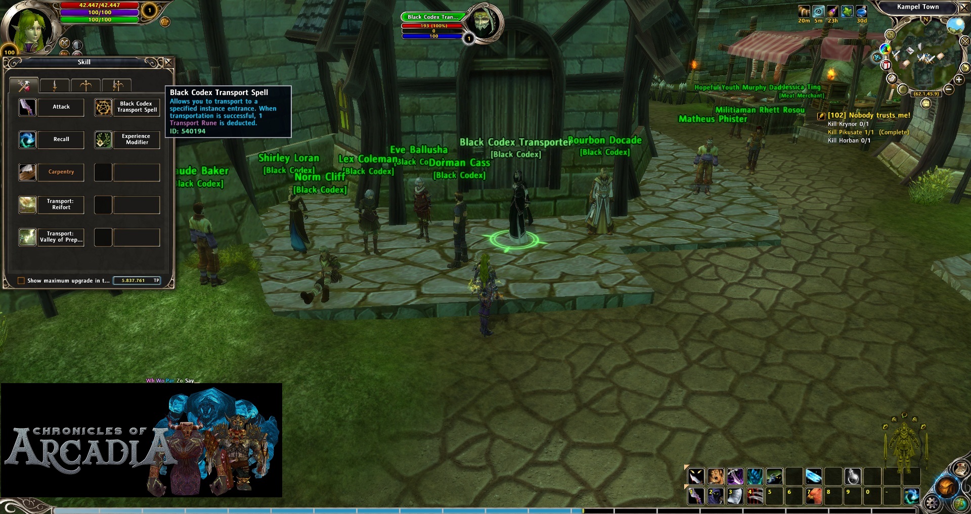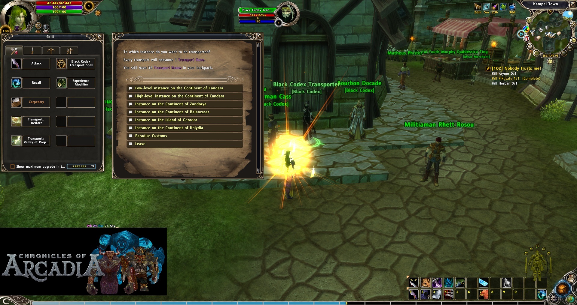It requires 200 Ancient Mementos (you probably have enough after doing the previous instances) and is sold by the NPC called “Black Codex Transporter”. She is in Kampel Town, a city inside Land of Malevolence map in the continent of Zandorya. The skill will appear next to the rest of your crafting or recall skills (“k” by default). This skill is called “Black Codex Transport Spell”. When you open it, you can click the region/continent you want to go and then select the instance. They are ordered by requirement level to enter. (Note: Your character will need to match the requirement level of every instance or this won’t teleport you there). Each travel cost 1 transport rune.