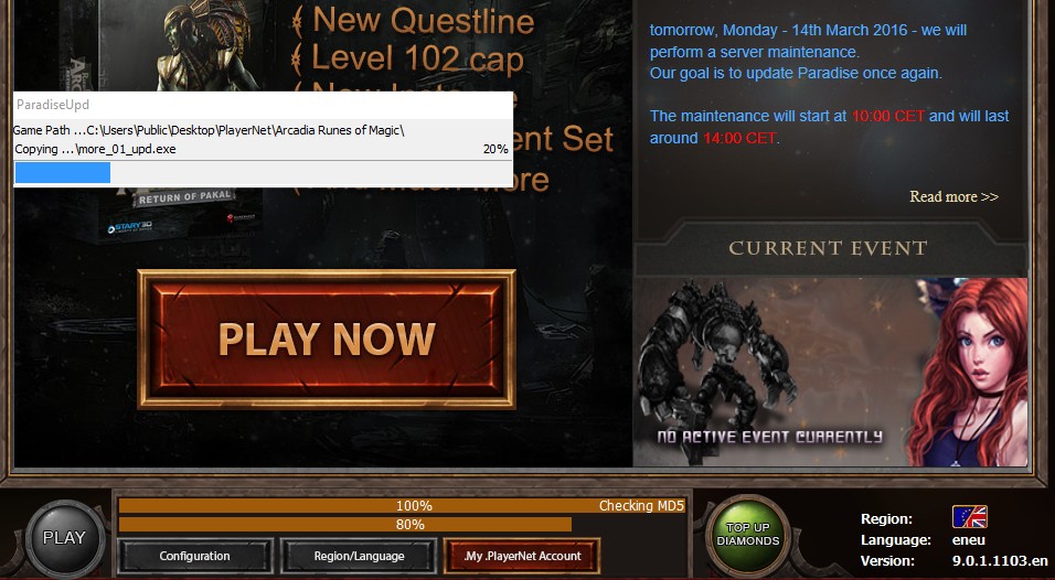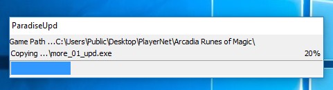 • Well, it is now just stuck. At least I am on the Arcadia Sign on Screen while the updates were downloading but for the last 30 minutes it is stuck, the top bar says 100% Checking MD5 and the bottom bar is at 80%. I saw it download the official Runes of magic 6. something and now it has stopped, that was the last thing I saw downloading. On the paradise UPD download screen it is at 20% and it has been like this for about 35 Mins now.