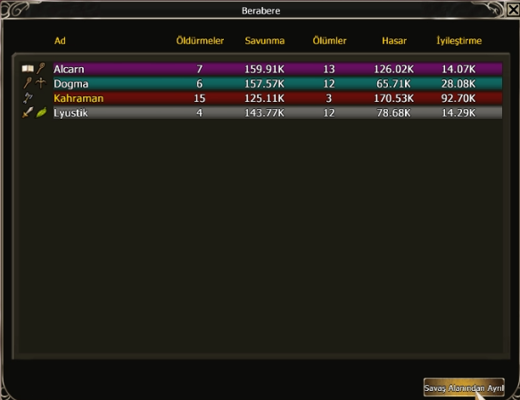Öldürmeler Savunma Ölümler Hasar İyileştirme K.D.A. Username(1) 7 159.91K 13 126.02K 14.07K 63.8 Username(2) 6 157.57K 12 65.71K 28.08K 53.6 Username(3) 15 125.11K 3 170.53K 92.70K 81 Username(4) 4 143.77K 12 78.68K 14.29K 49,4 Çünkü aşağıdaki video da görebileceğiniz üzere ben 1. olduğumu düşünürken oyun bana 1. lik ödülü vermedi.