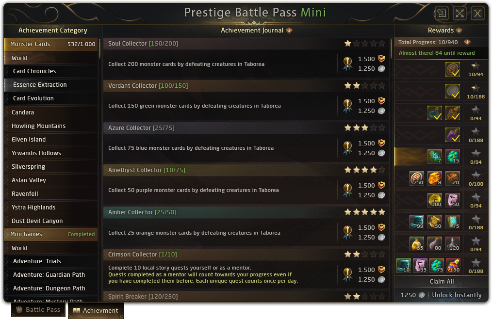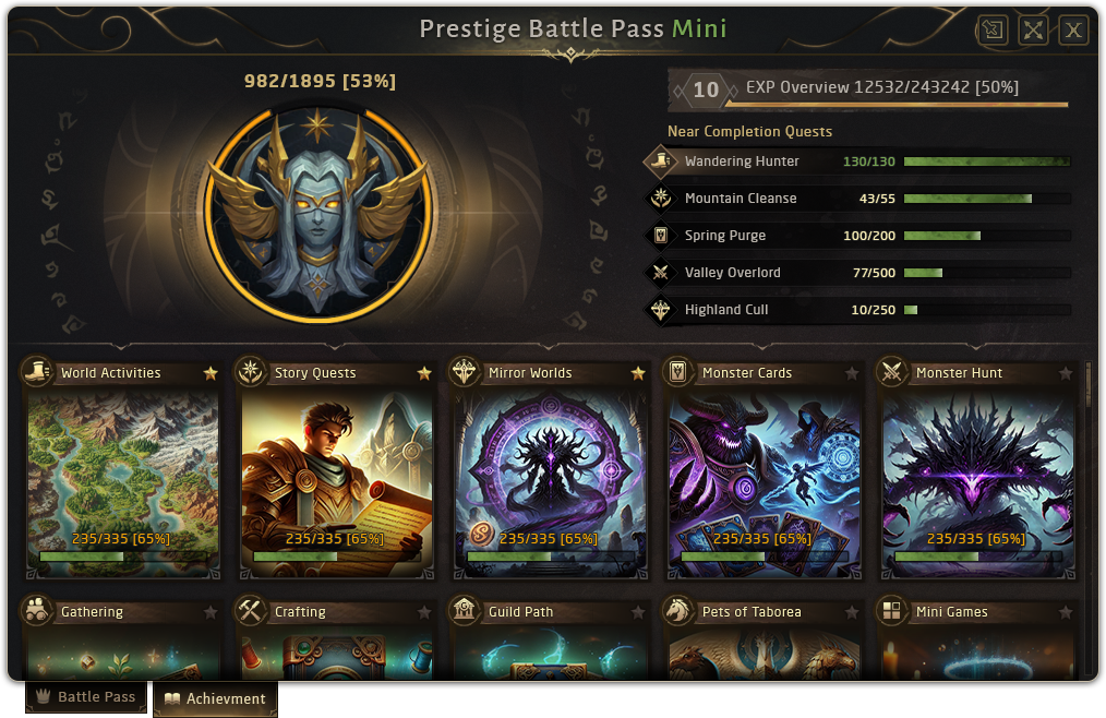 The complete list of 15 categories (which will be expanded in future seasons) will include:╔🢖 World Activities ╠🢖 Adventures ╠🢖 Mirror Worlds ╠🢖 Monster Cards ╠🢖 Monster Hunt ╠🢖 Gathering ╠🢖 Crafting ╠🢖 Guild Path ╠🢖 Pets of Taborea ╠🢖 Mini Games ╠🢖 Chronicles of Prestige ╠🢖 Markets of Taborea ╠🢖 Consumables ╠🢖 Gear Enhancement ╚🢖 Housing