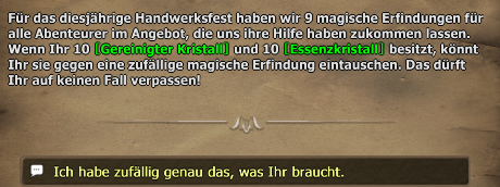 Accordingly to the wiki page (https://wiki.chroniclesofarcad…stivals/crafting-festival), you can exchange "10 Artisanal Crystals and 10 Essence Crystals" for 9 random items.