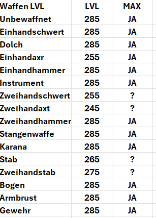 Einhandaxt, Zweihandaxt, Zweihandschwert, Stab und Zweihandstab sind die Waffen die nicht auf 285 gehen