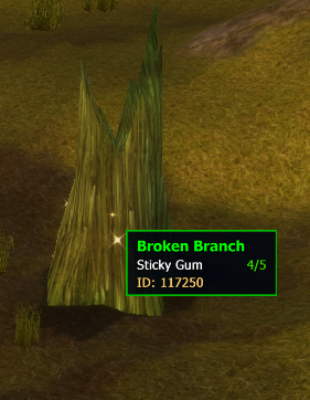 In this quest, I need to collect 5 pieces of 209460 [Sticky Gum]. This item is only obtainable by interacting with 117250 [Broken Branch] objects.