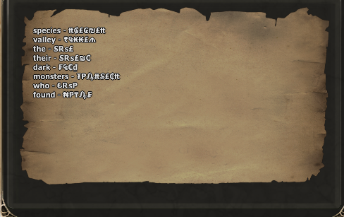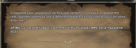 You have to solve a decrypting puzzle. In the first picture is your an encrypted sentence, you have to enter the translation to finish the quest. In the second picture you have some words and their encrypted counterpart (same amount of letters). That means, you can now go through and make a list of the ABC and by looking in the second picture, you can find all counterparts for each letter (or most of them). With the list, just simply decrypt the sentence.