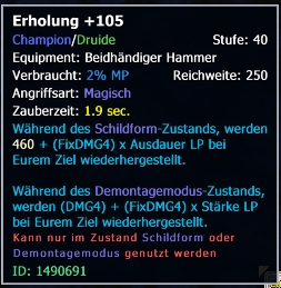 It seems that somewhere along the line the healing calculation got messed up for this class. Tooltip seen as follows is broken and healing barely reaches 60k with strength / endurance over 100k in the specific forms. The aoe heal/buff does 8 times (~250k times 2 from endurance/strength component) that healing for example. It's also kinda strange for the class having endurance based heal without the ability to wear plate gear. I know it's mostly only a support class, but it feels like there is missing potential.