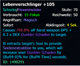 "Causes 790.8% off hand weapon DPS + 0.3 DEX Dark Damage to target."