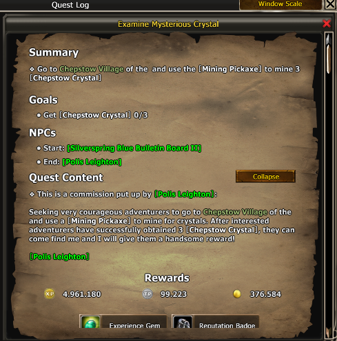 The quest asks players to go to Chepstow Köyü (Chepstow Village) to extract crystals using a pickaxe.