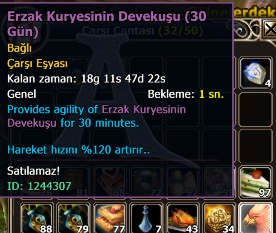 I bought 1244307 [Erzak Kuryesinin Devekuşu (30 Gün)] from the diamond market. When I use this item on myself, it gives me a 120% movement speed increase. I encountered a problem when I fought too many creatures in the world. When some creatures debuff 502583 [Yavaşlatma], this item on me disappears. I have to click the item again to reactivate it.
