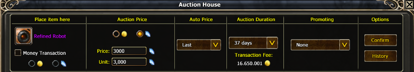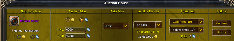 When I set the listing duration to 37 days, the system asks for a fee of 16,650,001 gold.