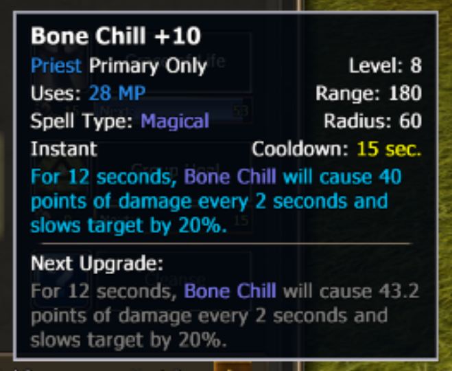 My Priest Mekyle's Bone Chill skills damage over time is not scaling with the level as detailed in the description.